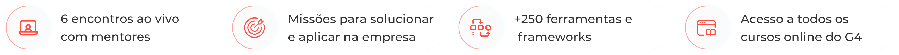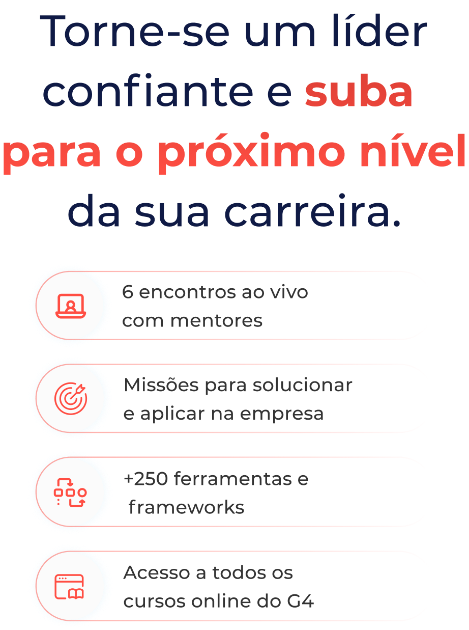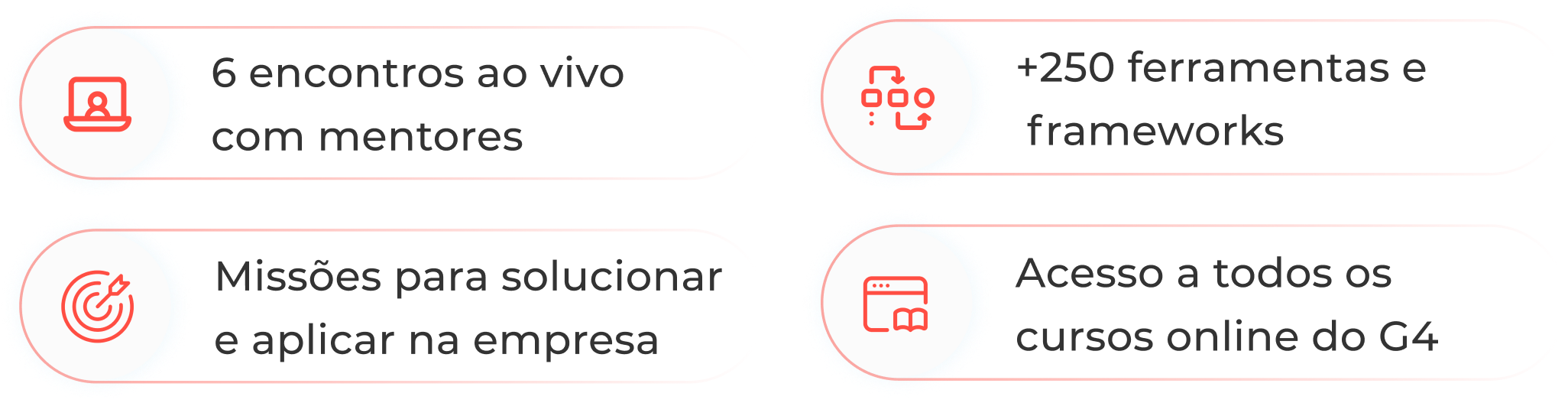No Programa G4 Gestão Tática, você desenvolverá os 6 pilares para aumentar os resultados da empresa e evoluir na sua carreira: